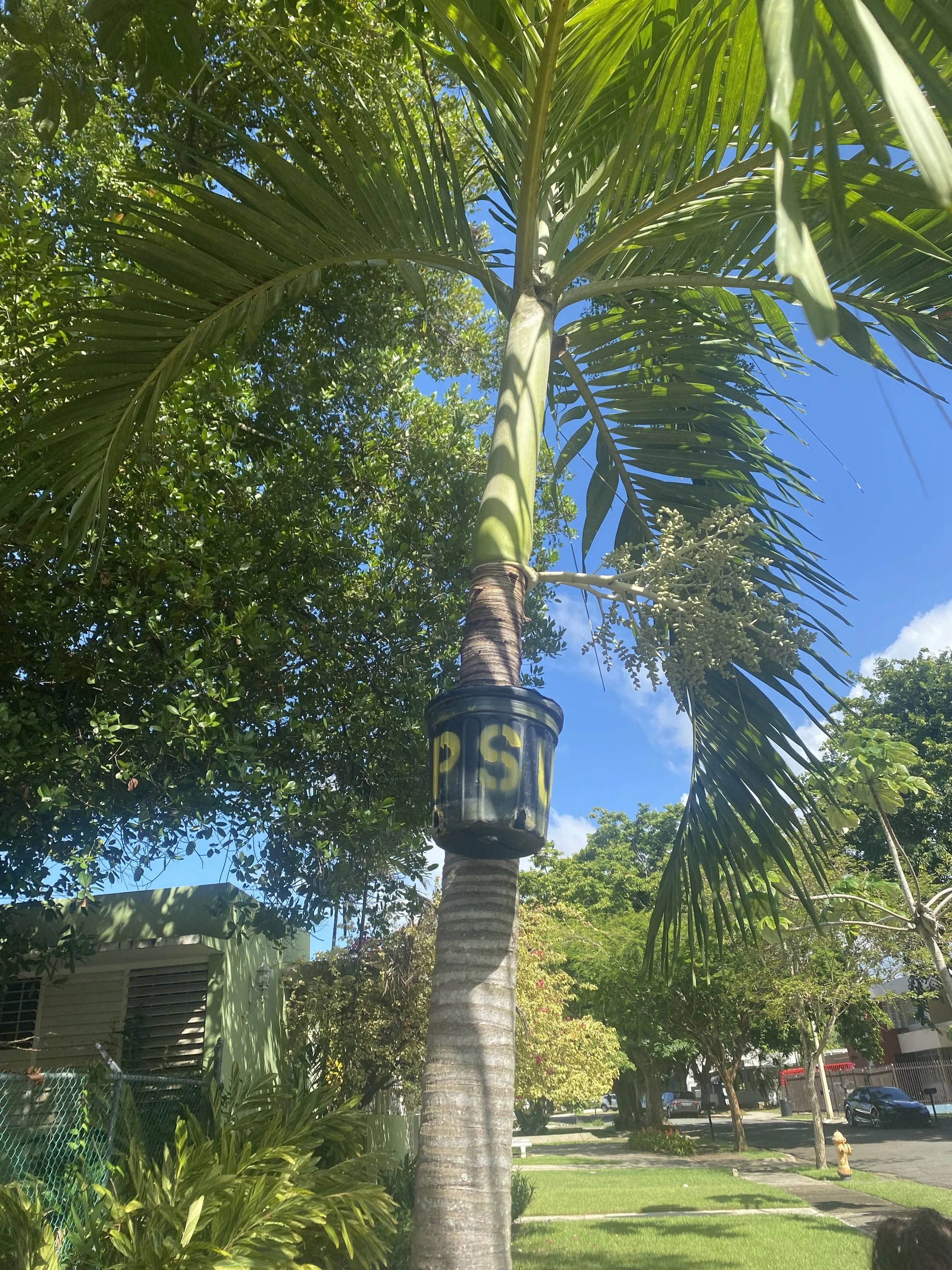 Las trampas de semillas se encuentran en postes eléctricos y en palmas a través de las calles donde realizamos conteos de aves. Escogimos estas estructuras por que son lugares donde las aves se perchan frecuentemente, aumentando la probabilidad de que la “caca” o excreta de las aves (que contiene las semillas de frutas que se han comido) caiga en la trampa. Verificamos estas una vez a mes para remover y catalogar sus contenidos.